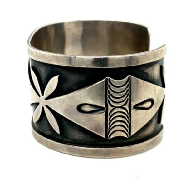 Sterling silver cuff with unique Hopi motif and antiquing. Width is 1 3/16 inches and weight is 49.3 grams with an inside diameter of approximately 6.5 inches including a just under 1 1/4 inch gap. No stamp but tested to sterling. NativeSterling Silver6.5"Thank you for taking a look at our jewelry!