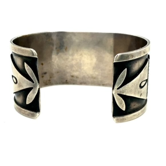 Sterling silver cuff with unique Hopi motif and antiquing. Width is 1 3/16 inches and weight is 49.3 grams with an inside diameter of approximately 6.5 inches including a just...
