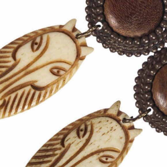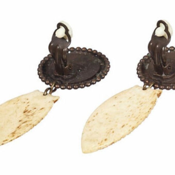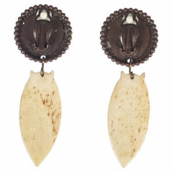 Edouard Rambaud safari clip back drop earrings with granulated brass base set with round piece of wood and carved cow bone, circa 1980. Signed “Edouard Rambaud, Paris.” Dimensions: 3.5" L x 1.25" W