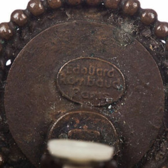Edouard Rambaud safari clip back drop earrings with granulated brass base set with round piece of wood and carved cow bone, circa 1980. Signed “Edouard Rambaud, Paris.”...