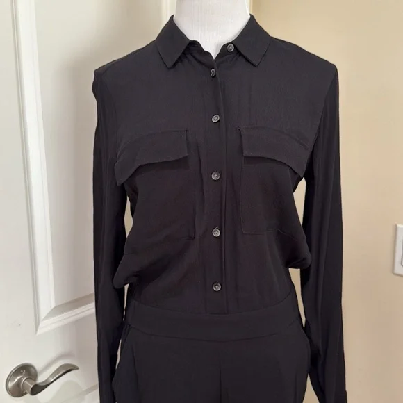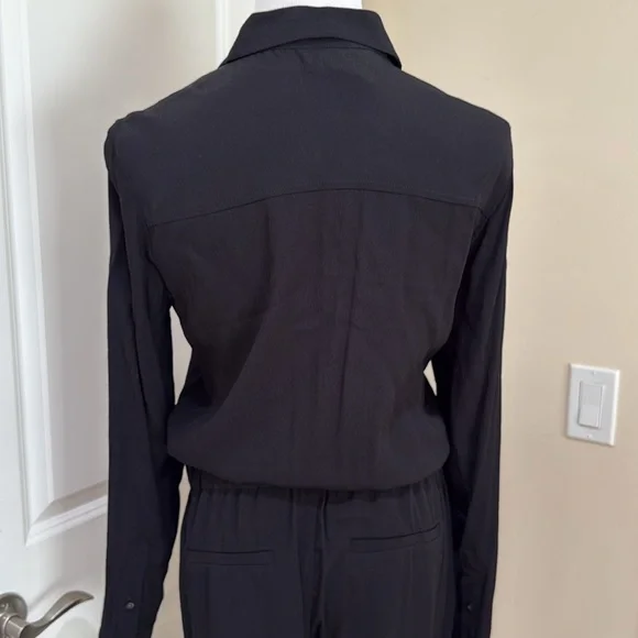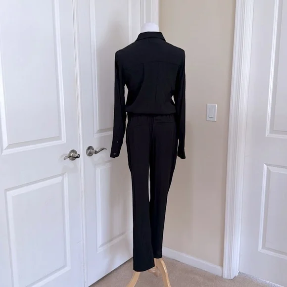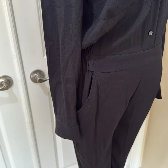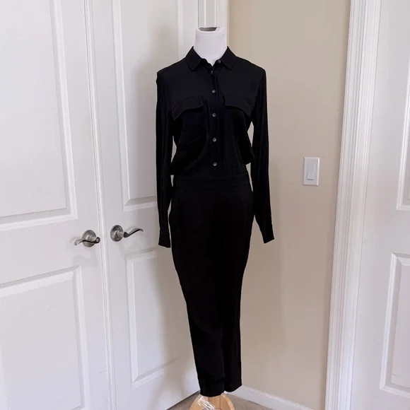 NWT Madewell Long Sleeve Button Down Classic Black Jumpsuit Size Small. Small pinprick hole near the inside label. No additional flaws. New With Tags!Details:Long sleeve jumpsuit100% viscousButton down styleTwo front flap pocketsTwo slit pants pocketsTwo faux back pocketsElastic waistbandCollaredButtons on sleevesThe material is very lightweight and slightly sheerApproximate Measurements:Pit to Pit: 17"Waist: 15"Sleeve Length: 24"Inseam: 27.5"Full Length: 58"