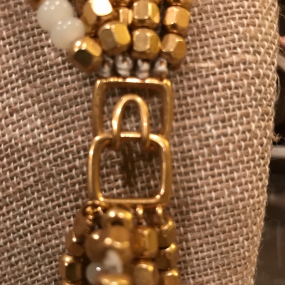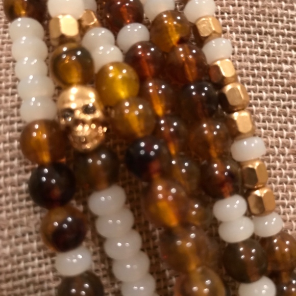 From India Hicks FINAL Collection, THE GOLDEN BEACH NECKLACE, is a 21” Length Multi Strand Of Tiger Eye, Acrylicand Gold Brass Plated Beads. The closure is India Hicks signature designed Gold Plated Brass Hook which is as interesting worn to the side as the back. Hidden amongst the beaded collection is the Treasure of the Islands Skull. Unique and Mysterious this Golden Beach Necklace is from THE WILD SIDE COLLECTION & is brand new with original Dust Bag and Box.