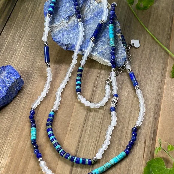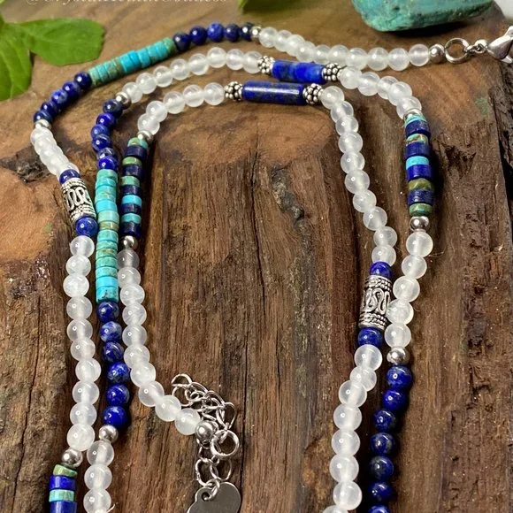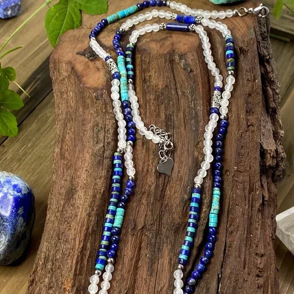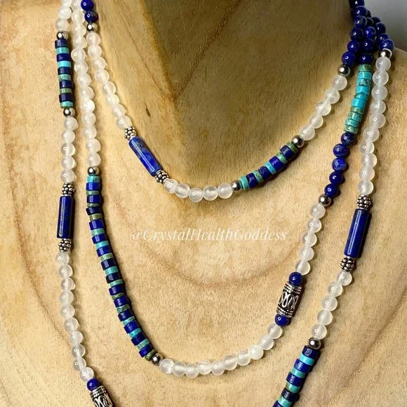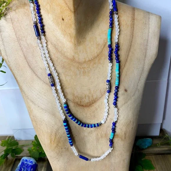 DESCRIPTION: Absolutely stunning extra long at 45" inches Gemstone Necklace, created using 100% Natural and Genuine Selenite, Turquoise Stone, and Lapis Lazuli. Only Top Quality Crystals were used in the creation of this magnificent Necklace. Since this necklace design is quite long, it can be wore in many different ways.I took several images using a long wooden female torso, to display a little better the many different ways you can wear it. This Necklace is truly a stunner that will have people asking you were did you get that? Please refer to my site if they ask;-) You are going to love this fabulous Necklace so much, your satisfaction is completely guarantee.Colorful, classy, and perfect to wear with an elegant dress or casual. I personally love this necklace and hope you love it too.SIZE: The Necklace size is 45" inches long, including the extension chain.BEAD SIZE: The Selenite beads are 4mm, the Natural Turquoise Heishi beads are 3.5-4mm, the Lapis lazuli beads are 4mm, and the Lapis lazuli tube beads are 1/2 inches. The metal beads are fine Silver and 304 Stainless Steel for it´s durability.CRYSTALS AND STONES: Top Quality 100% Natural and Genuine. These are NOT imitation (beware of fakes) lab created dyed, or synthetic. When you buy from me, you are paying for quality and the guarantee of buying real stones.METAL FINDINGS: 925 Sterling Silver Feel free to ask any questions, thank you for looking & your support.