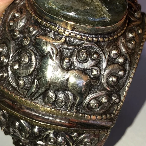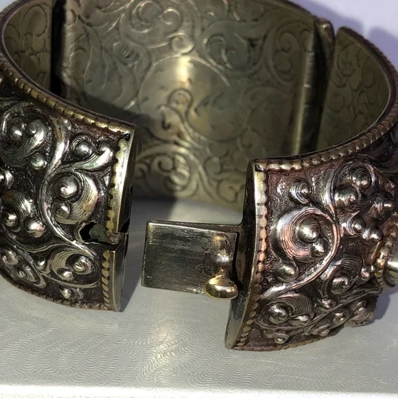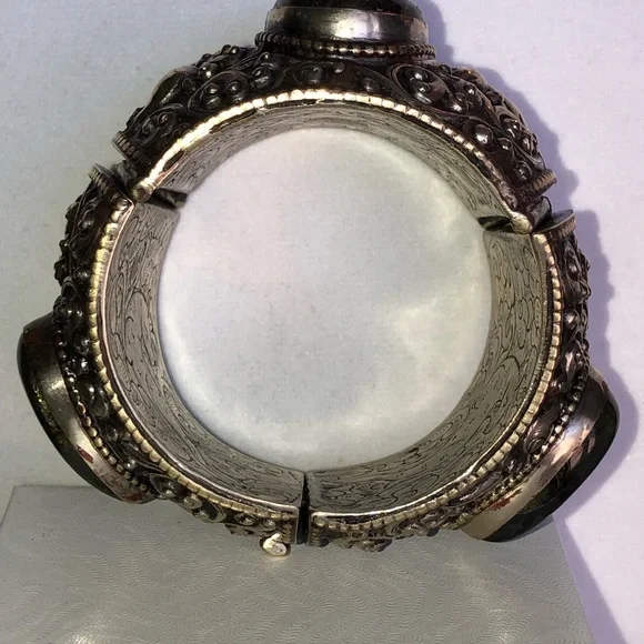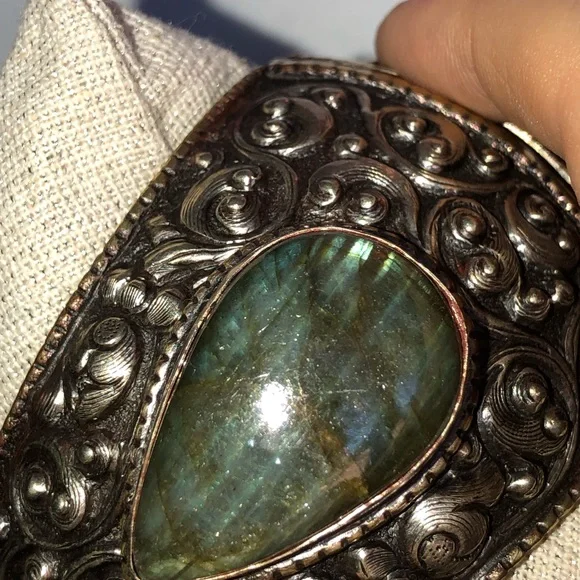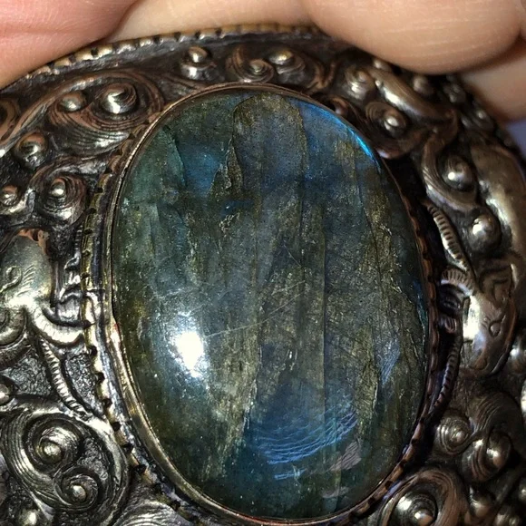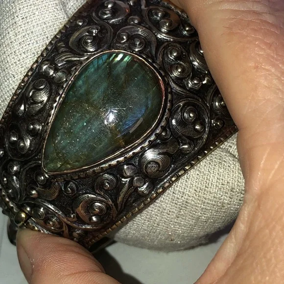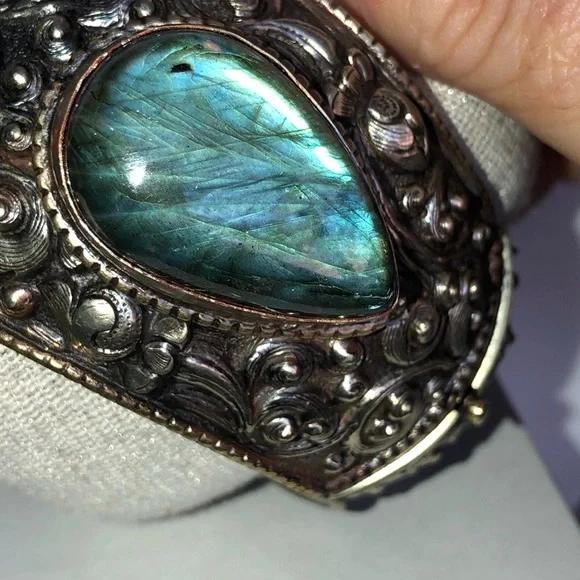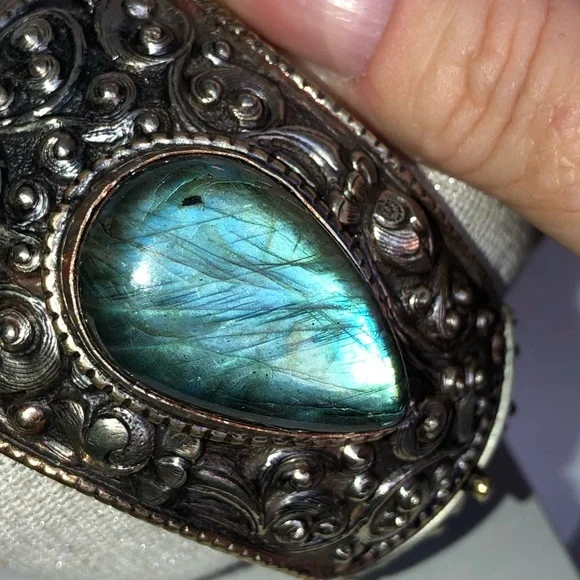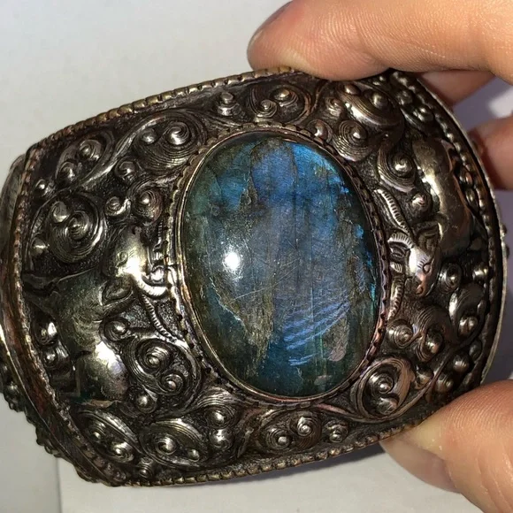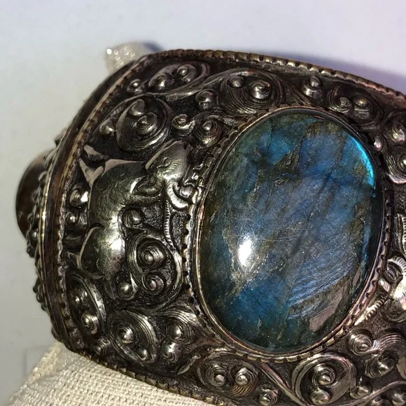 Made in Nepal AAA Blue & Green Labradorite Gemstones (145.28 cts) in Sterling & Other Silver Metals Bracelet *Snap Lock Closure**Hand Carved Design on Outside & Inside of Bracelet