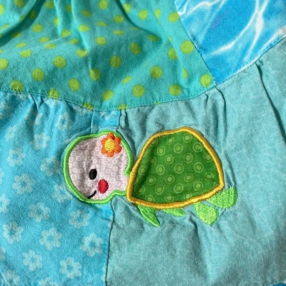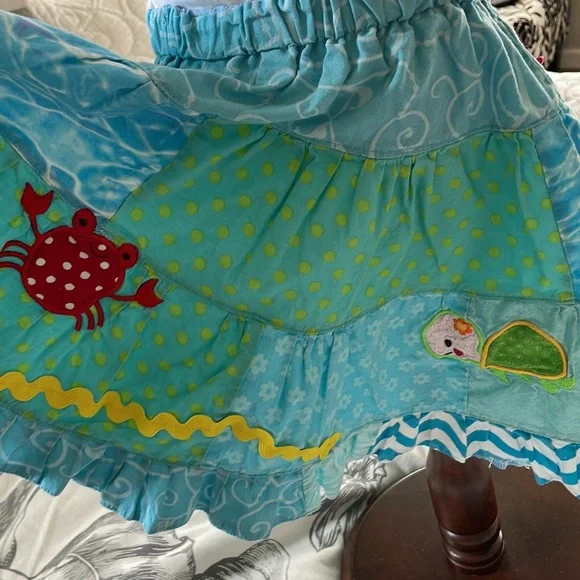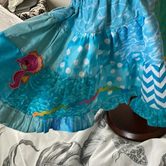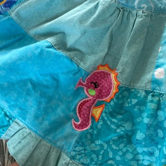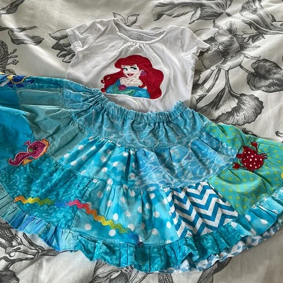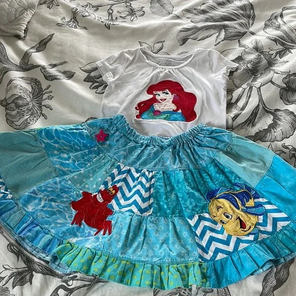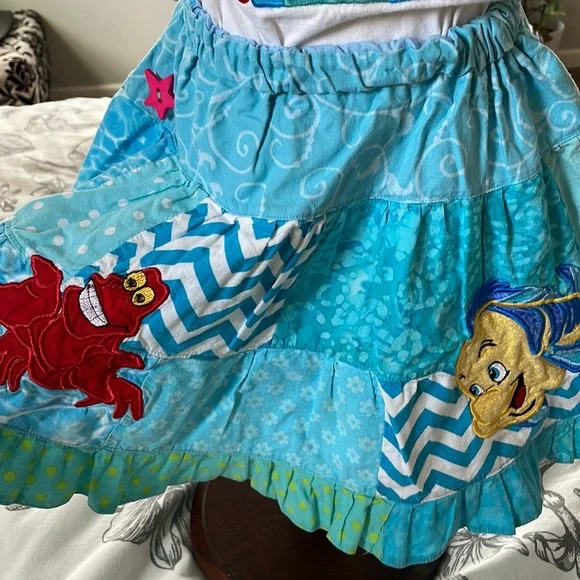This a cute little outfit that if you are Disney fan like I am would love to have got it at Etsy has a lot of characters appliqués is well made the top is the childrens place brand but they added the mermaid appliqué skirt is handmade like quilting pieces and cute appliqués a lot of details