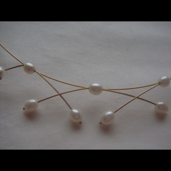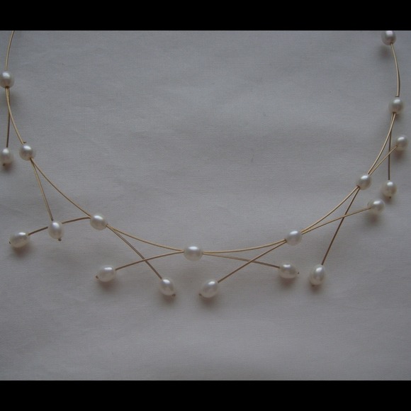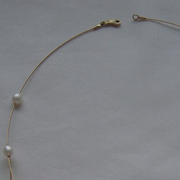 14K(stamped) yellow gold, freshwater pearl, free form, 17" wire necklace. Features 22 pearls ranging in size from 5.5mm to 7.0mm in size. White in color with few blemishes and good luster. Well matched. Wire is .5mm thick with claw clasp. Weight is 8.9 grams. Appraised for $975