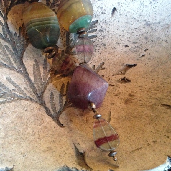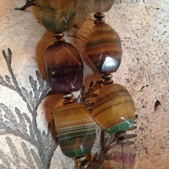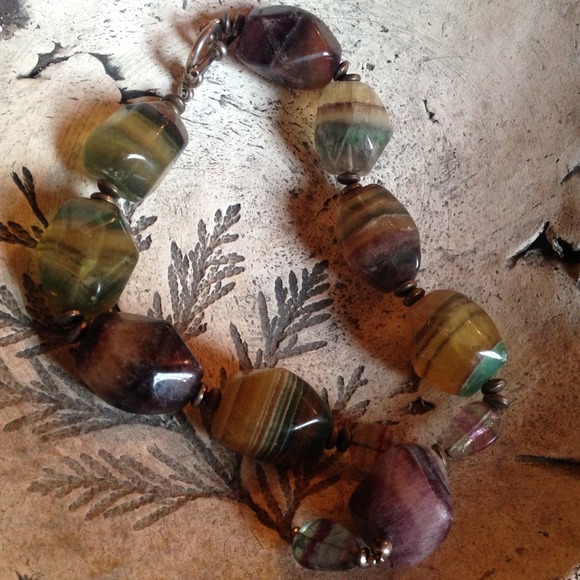 Natural rainbow fluorite 1.5" chunks and carved pieces in shades of greens, yellows, and purples with sterling silver toggle clasp and beads. Perfect for all seasons! Custom, one...