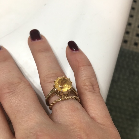 Large citrine in crown setting, 10k vintage gold band adorned with tiny citrine rounds ... size 7