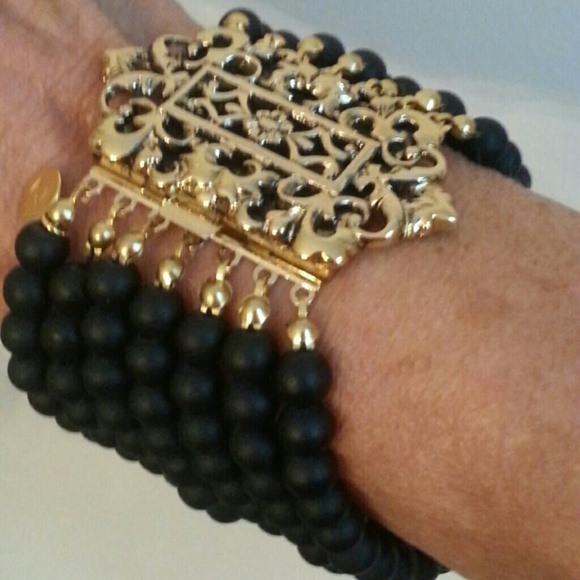 Custom 7 Stand bracelet in beautiful black seaglass. The focal points is a stunning filigree clasp. It is a quality piece, heavily gold plated and custom made in Germany.One of a kind statement piece by Designsbyz.