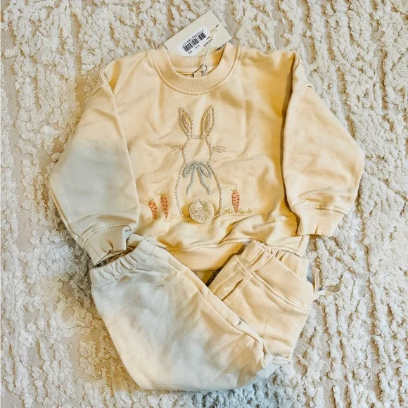 Cream sweater with cute embroidery by Wild Wawa. Perfect for cozy days. Bunny track suit size 18-24. New in bag w/tags.