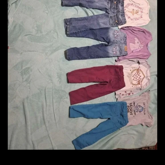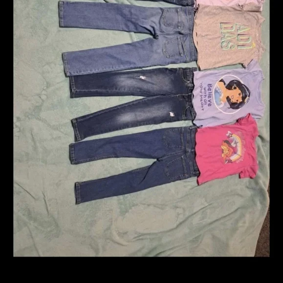 Adorable kids clothing set featuring jeans and colorful pants. Includes tops with fun designs.