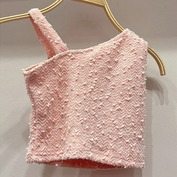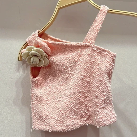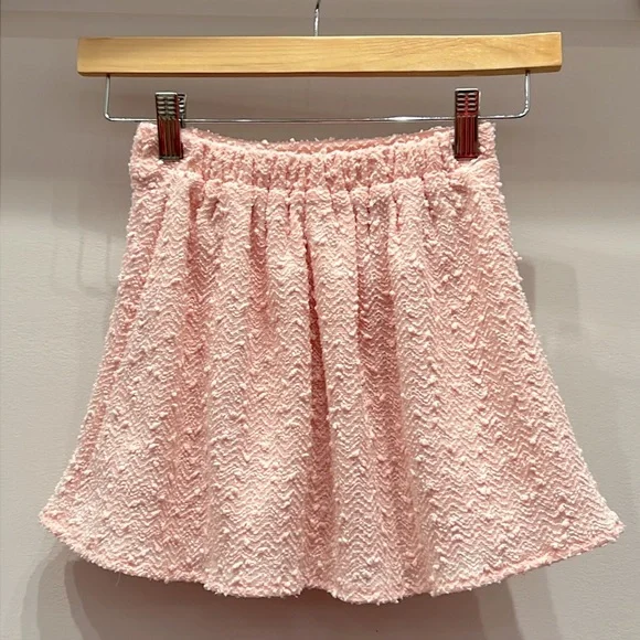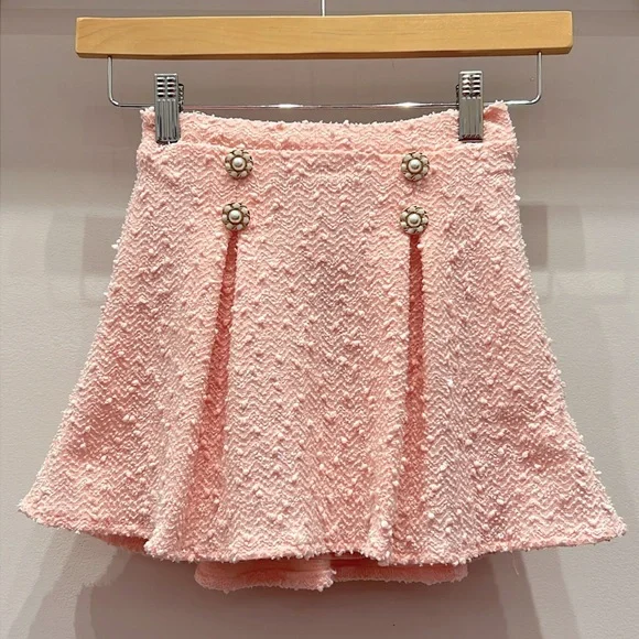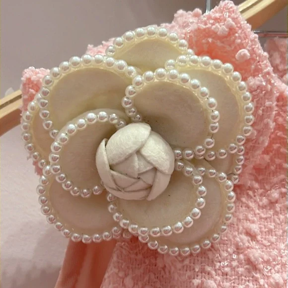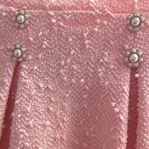 Sophisticated pink tweed skirt set is fully lined, slightly stretchy and features an asymmetrical top, statement flower clip that detaches from bow on shoulder of bodice, matching skirt w/pleated detail, elastic waist and flower button accents- perfect for photo-ops, parties and special occasions