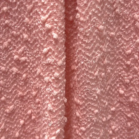 Sophisticated pink tweed skirt set is fully lined, slightly stretchy and features an asymmetrical top, statement flower clip that detaches from bow on shoulder of bodice, matching...