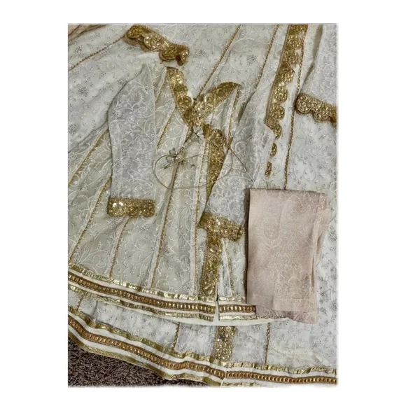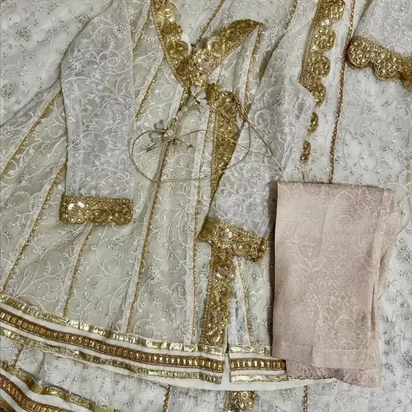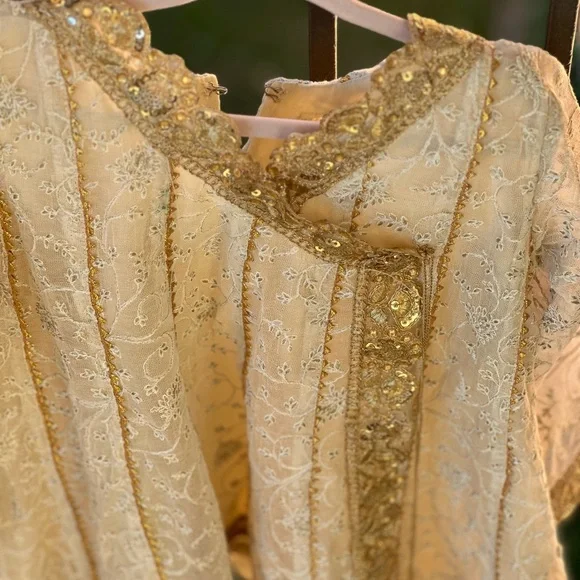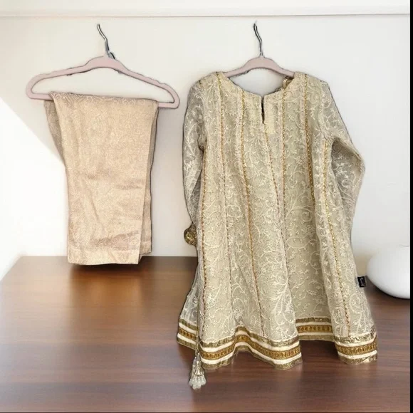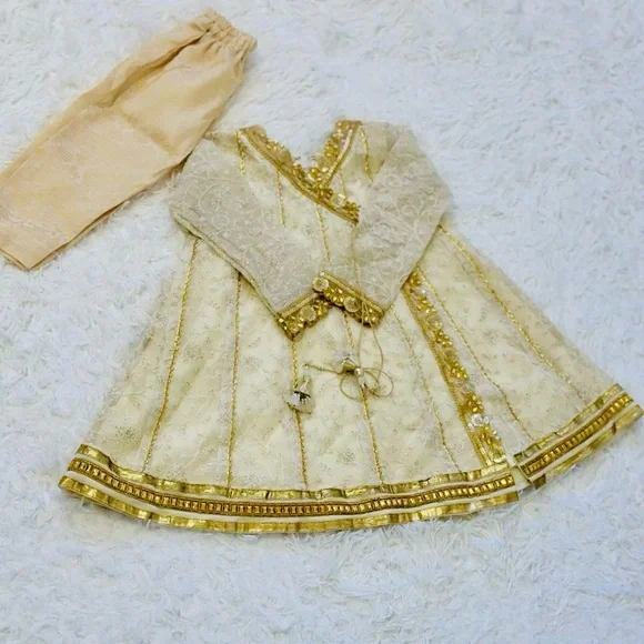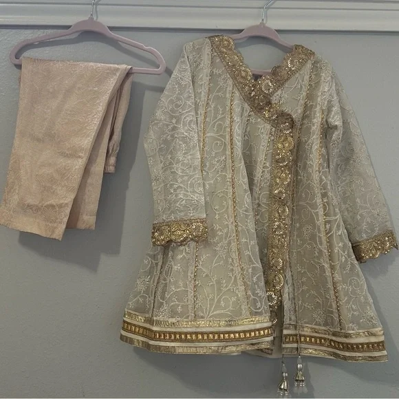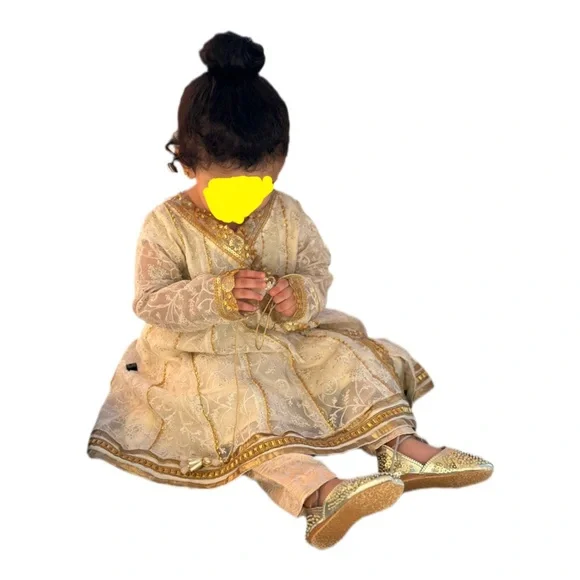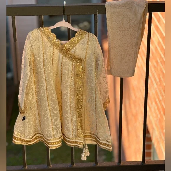 Stunning Desi toddler 2 piece Outfit with intricate gold embroidery. Features delicate lace details. Perfect for special occasions.available in size 1Y -2 Y and 2Y to 3 Years The sets include a Dress with matching pants Feel free to ask me if u have any questionsDress and matching pants for toddler sized 1 year to 2 yearsMeasurements:Chest: 13 inchesShoulder:10 inchesSleeve length:13.5 inchesLength: 22Dress and matching pants for toddler sized 2 years to 3 Measurements:Chest: 14 inchesShoulder: 11 inchesSleeve length: 14 inchesLength: 23