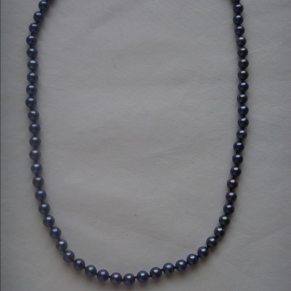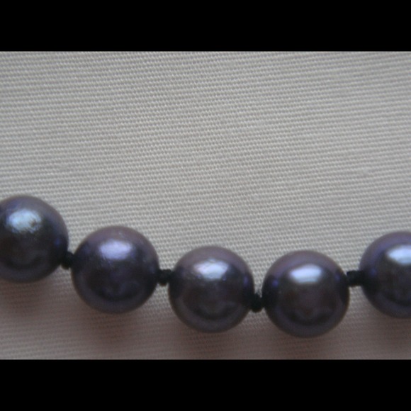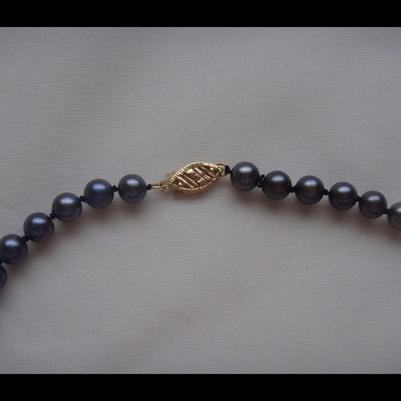One 18" strand of cultured black pearls. Pearls measure 5.5mm x 6mm. Sixty-nine pearls in total. The color is black with a slight green overlay. They have good luster, well matched in size and color, with medium blemishes. They are double knotted with a filigree pearl clasp. Appraised in 2004 for $1000