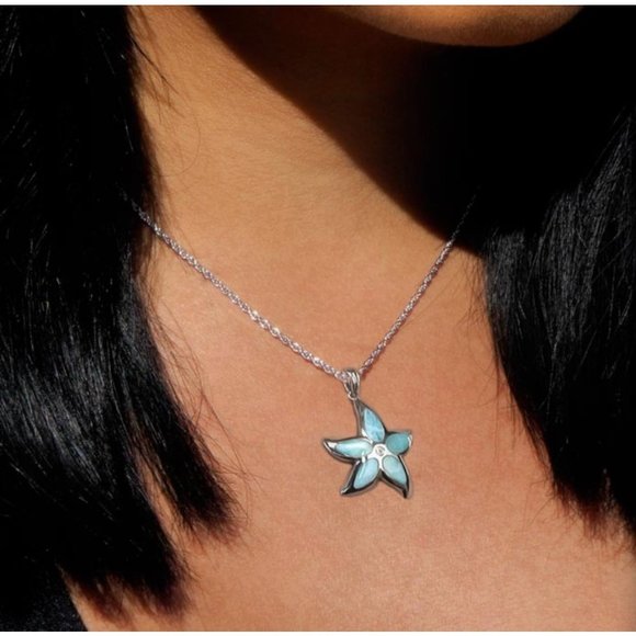 The beautiful beachy tones of free-form larimar create this whimsical starfish pendant necklace from Marahlago accented with a hint of white topaz sparkle.Larimar: 2 x 7mmWhite Topaz accentSet in sterling silverApprox. adjustable length: 21"; approx. drop: 1-3/8"Lobster claspFeatures:• NecklaceSize: Womens One SizeCondition: New With DefectsLight defects on pendant, PLEASE REVIEE PICTURES.
