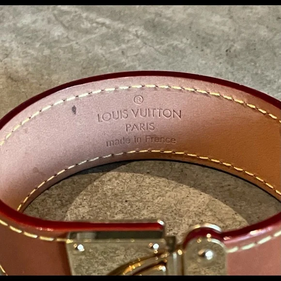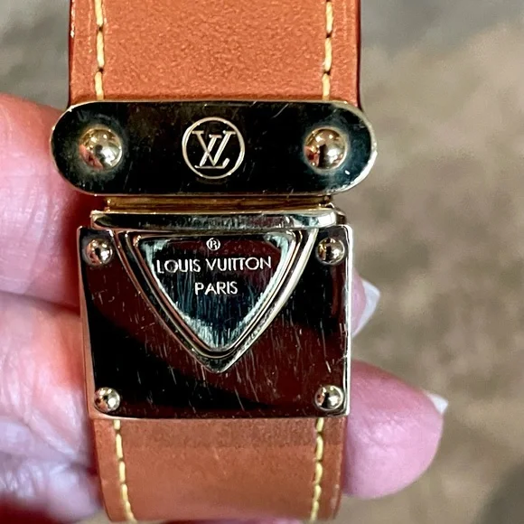 Beautiful authentic Louis Vuitton Koala Suhali luggage tan leather cuff with gold tone push lock detail & engraved logo & name on hardware. Only worn a few times. Has a couple of...