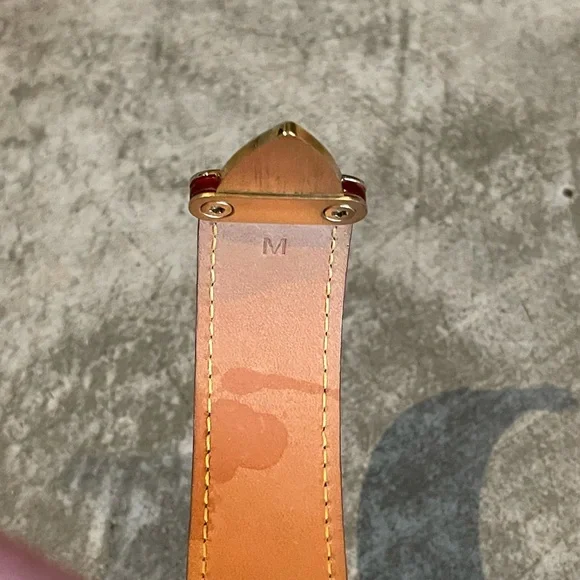 Beautiful authentic Louis Vuitton Koala Suhali luggage tan leather cuff with gold tone push lock detail & engraved logo & name on hardware. Only worn a few times. Has a couple of minor scratches in the leather & in hardware.Size: Medium Measurements are Approx: 8”L x 1”W x .9”D