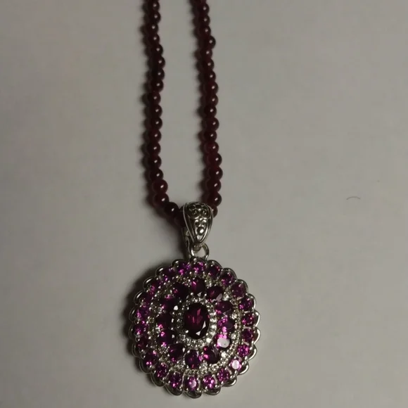 Stamped .925 Orissa Rhodolite Garnet, Sapphire and Diamond Necklace.19" long.1 1/4" Pendant.