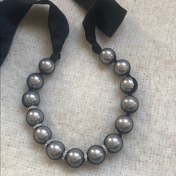Black silk with netting over faux pearls with 6 rows of crystalsShips with original box - necklace is pristine, box shows light wearPearls are 3/4” diameterPearl necklace length is 13”Total length is 52”Can be worn as a necklace, bracelet, belt, hair bandPurchased at Barney’s