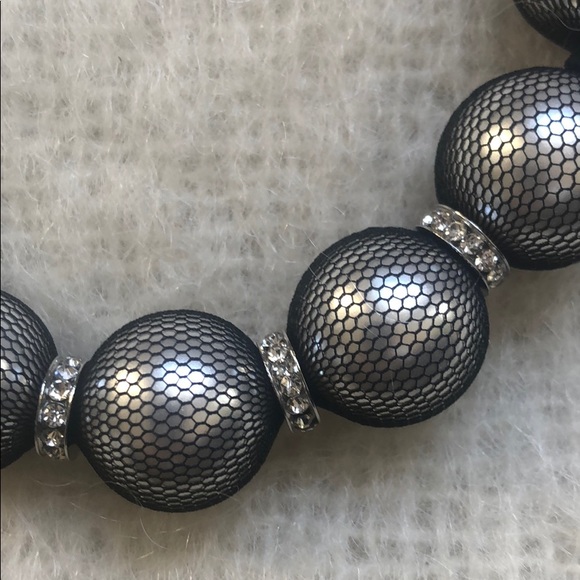 Black silk with netting over faux pearls with 6 rows of crystalsShips with original box - necklace is pristine, box shows light wearPearls are 3/4” diameterPearl necklace length...