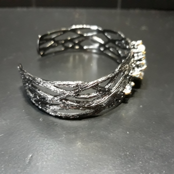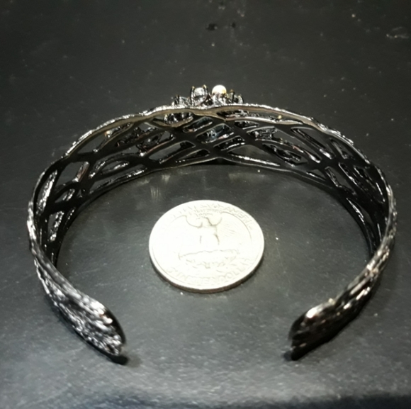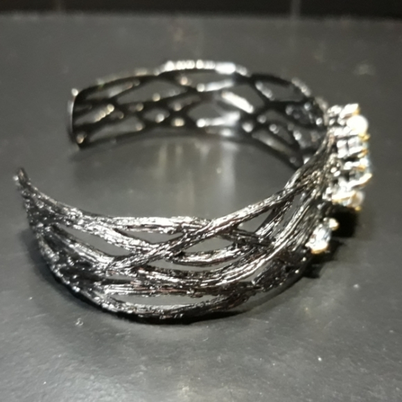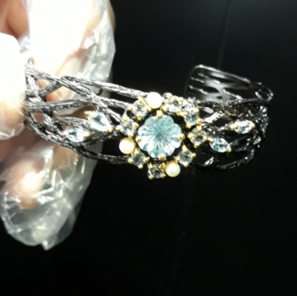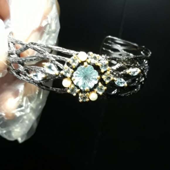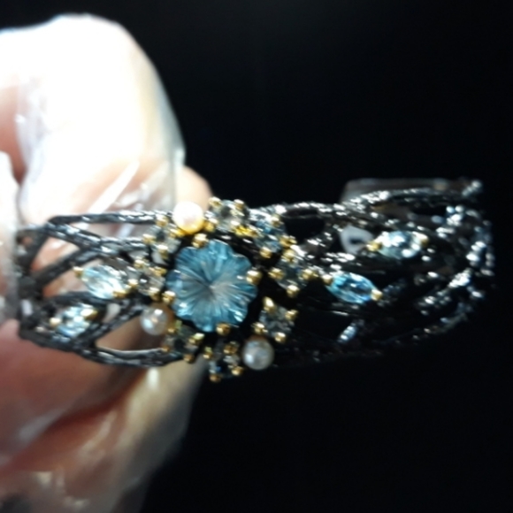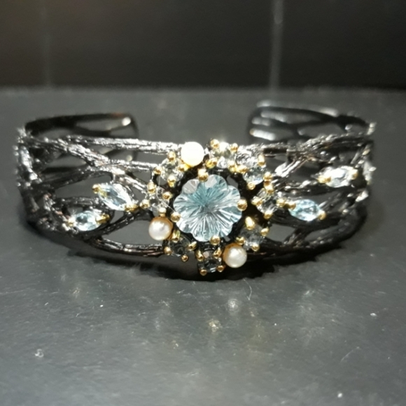 One can easily view the masterful craftsmanship that was employed to create this one of a kind beauty! Blue topaz gemstones and a few pearls play along the wood motif lattice of black rhodium over sterling silver. Sm/Med