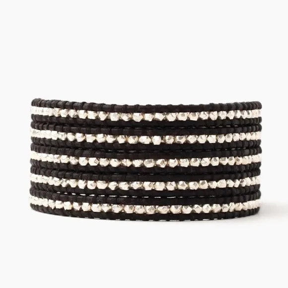 In EUC.Only worn a dozen times or so.Five wrap bracelet featuring sterling silver nuggets on natural black leather. Fastens with a Chan Luu oval button.Sterling silver nuggets and oval button closure, natural black leather.Adjustable closure. Approx. 32" / 33" / 34" in length.Handmade in Vietnam.