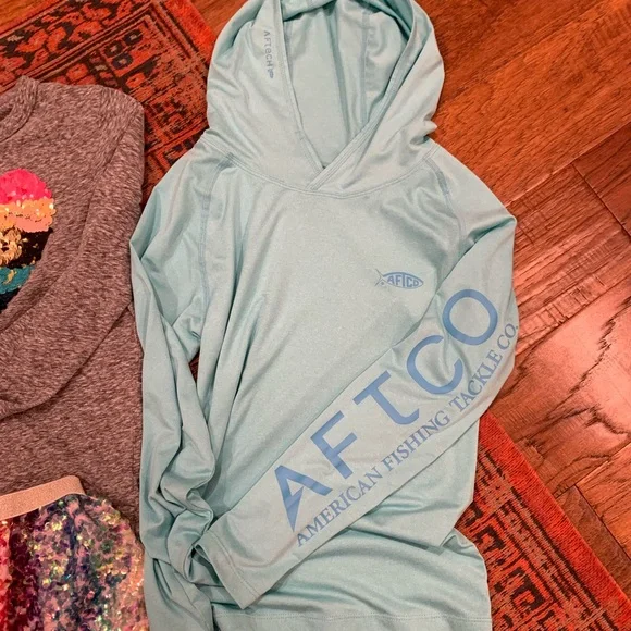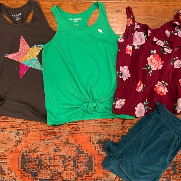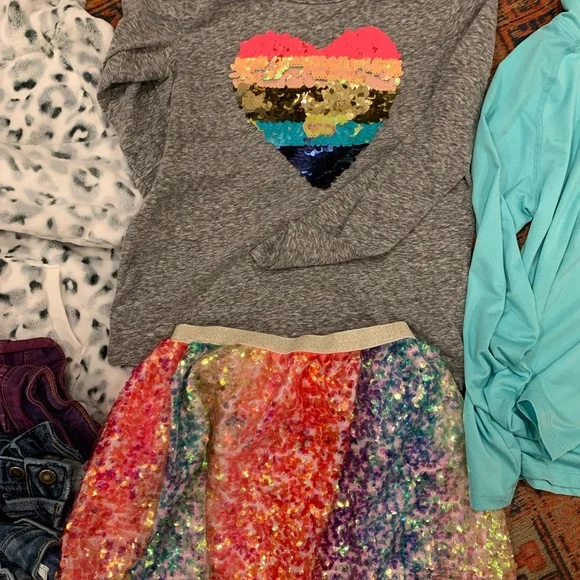 Beautiful Lot with several pieces we’re sad to have outgrown. Features:4 pairs of Jeans (2 are KanKans from Buckle & 2 are Gap)3 sweatshirts/hoodies- purple is Athleta, pink from StitchFix, Leopard is BKE from Buckle)2 Abercrombie tank tops (green & floral)1 Cat & Jack tank top1 pair Tea Collection terry shorts in beautiful rich green Aftco fishing shirt with SPFRainbow sequin skirt from H&MRainbow Heart long sleeve flippy sequin from J. Crew