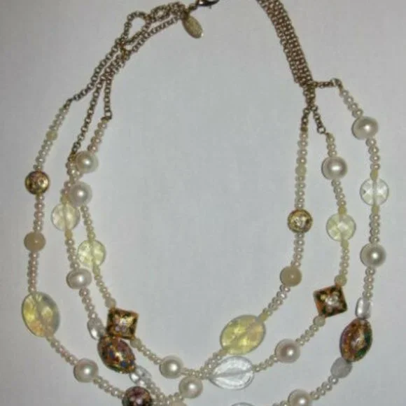 Gorgeous and very elegant.Triple strand Miriam Haskell necklace has a very east Indian feeling.Necklace has faux pearl, cloisonne, and opalite glass beads.Necklace measures 17...