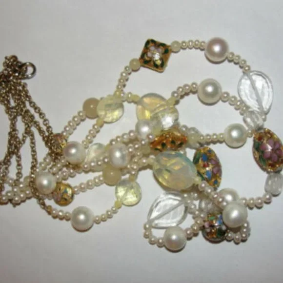 Gorgeous and very elegant.Triple strand Miriam Haskell necklace has a very east Indian feeling.Necklace has faux pearl, cloisonne, and opalite glass beads.Necklace measures 17 1/2", 18 1/2", and 19 1/2".Closes with lobster clasp and jump ring.Signed on hang tag, "Miriam Haskell".Perfect to wear with gold bangles during the day or a fantastic night out piece.