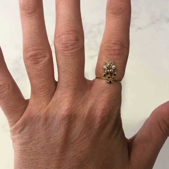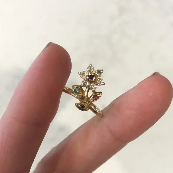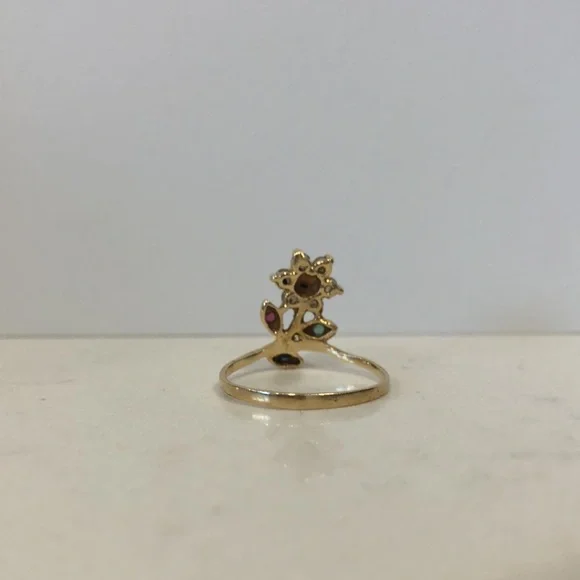 Stunning vintage 14 kt gold flower ring with diamonds and other precious stones. Not sure exact size but fits more like a 6 womens