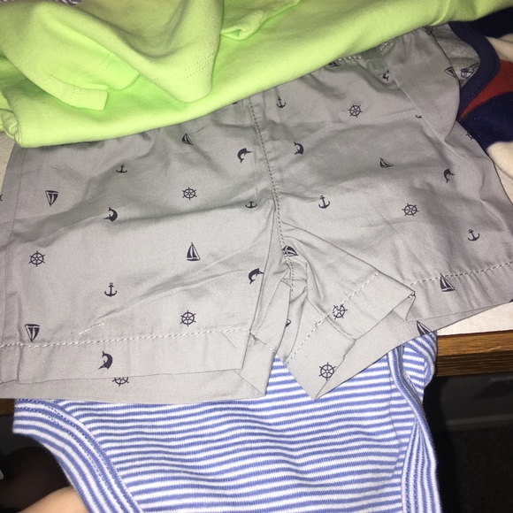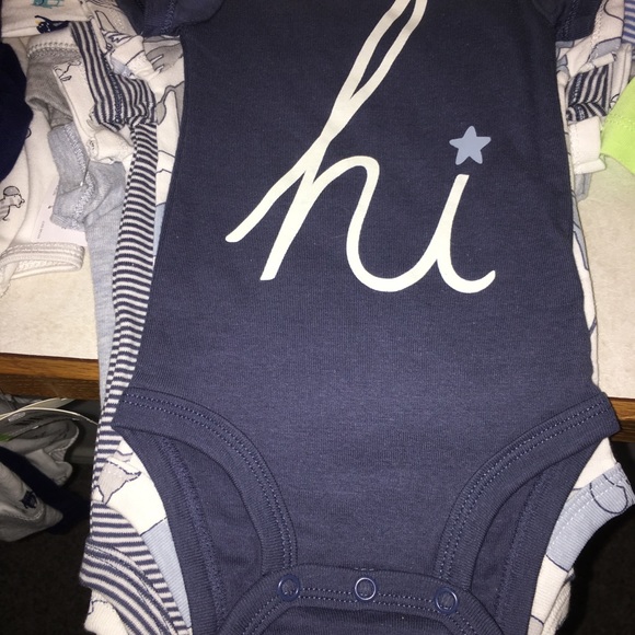 0-3 month three piece vest set • 3 month five onesies set • 3 month three piece jacket set • 3 month two footie pajamas • 3 month footie pajama with bib • 3 month camo jacket • 6 month onesie, shirt, and shorts set. All but one is Carters brand. All brand new with tags.