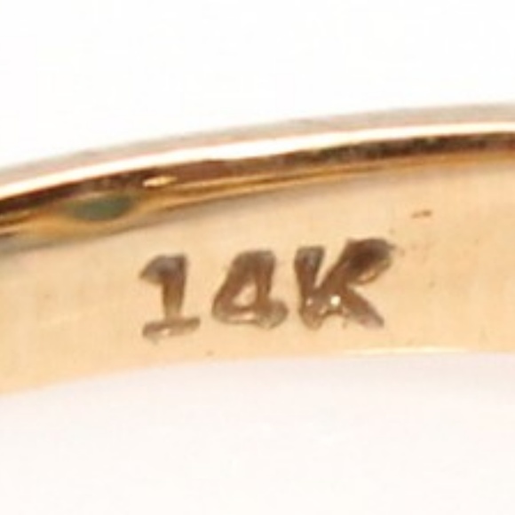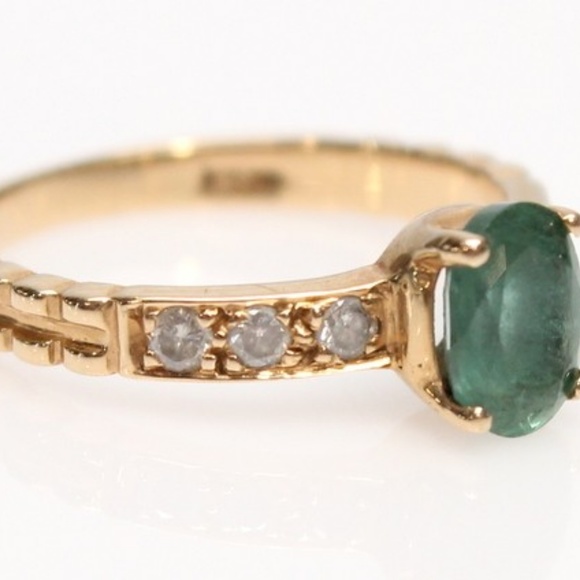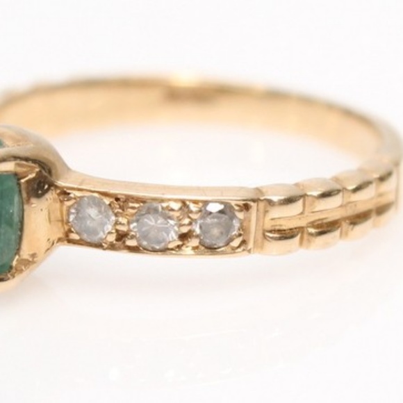 Genuine 14K Gold, Genuine Emerald, 6 Genuine Diamonds, ring size 5.75.This is a beautiful ring! The center stone is 5mm x 7mm; weight is 2.5g.There is some surface wear/scratches; gemstones may have natural inclusions, flaws, feathering, cloudiness, etc. No visible chips or cracks.