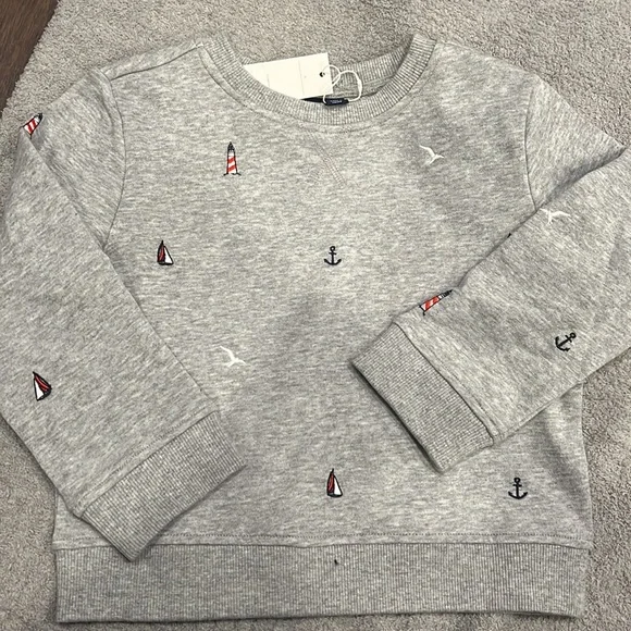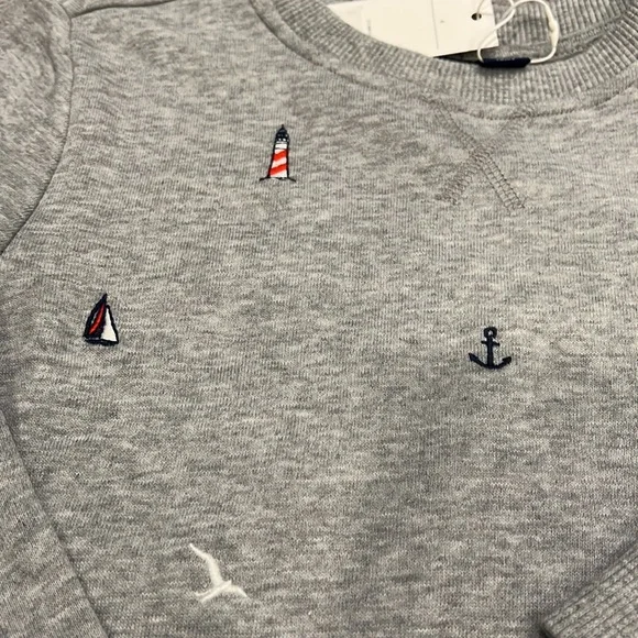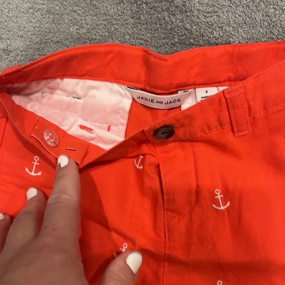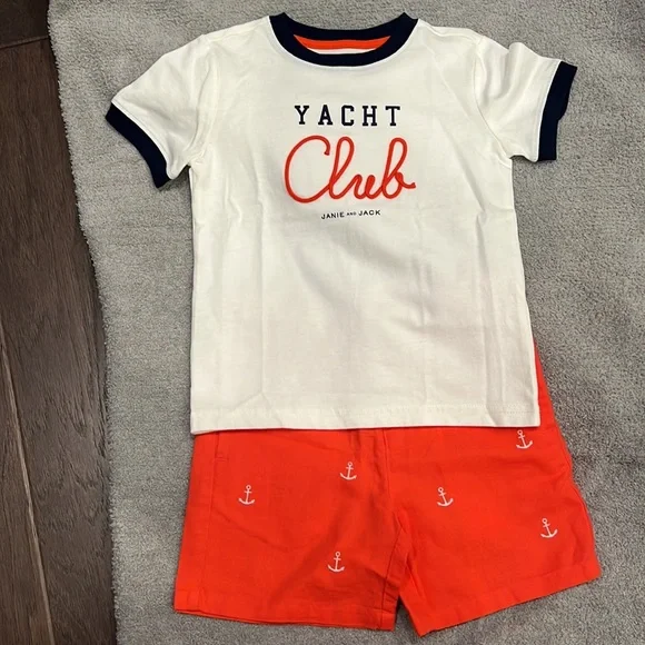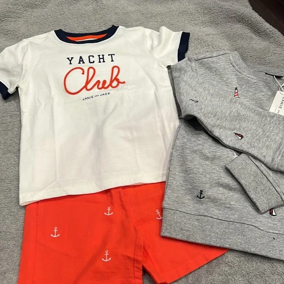 Show stopper brand new, never worn 3 piece short set for your little gentlemen. All 3 pieces part of the same collection from Janie and Jack. Shorts are a orange/red linen with white anchors and an adjustable waist. Shown with matching shirt with writing detail. Matching sweatshirt super soft with boat, anchor and lighthouse details. Great for a summer day into night. Shorts and T-shirt are a size 3 and sweatshirt is a size 4 (I like to upsize in cozy sweatshirts)