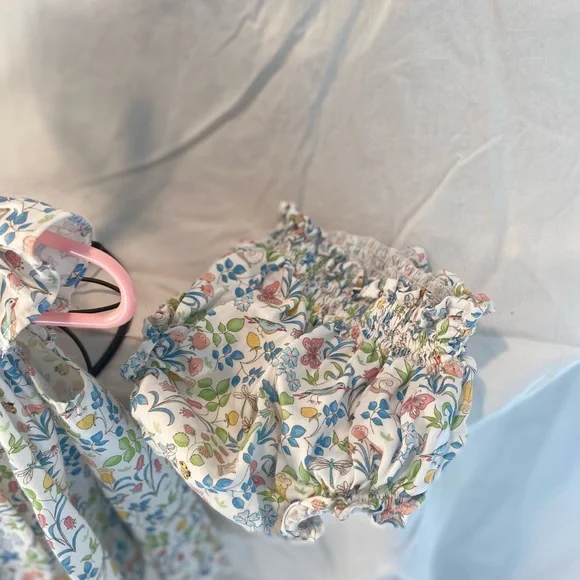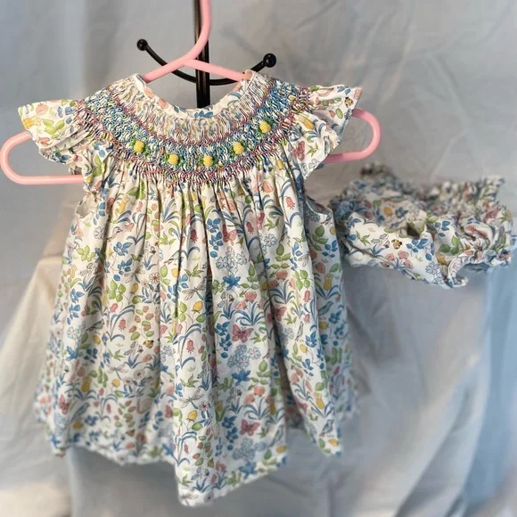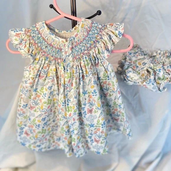 Purchased from Maisonette. Beautiful perfect conduction Los Encajeros “ MiniZumaya floral set”. The floral with petite insect pattern is just lovey. The material is soft. Button closure in the back and beautiful smocking in the front. No special cleaning needed.