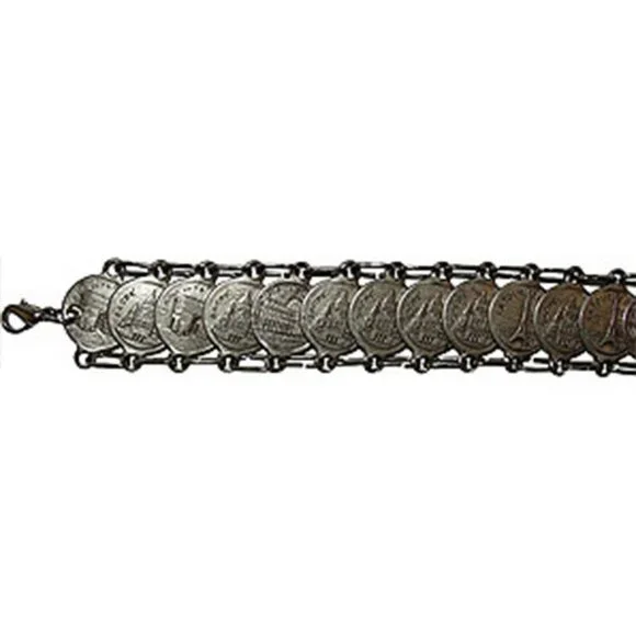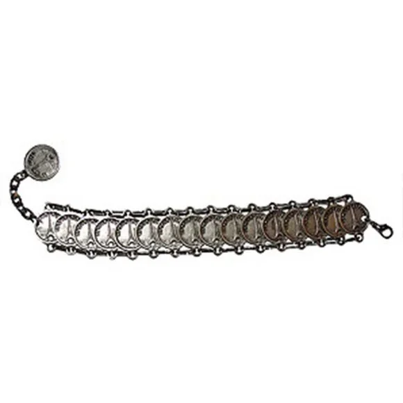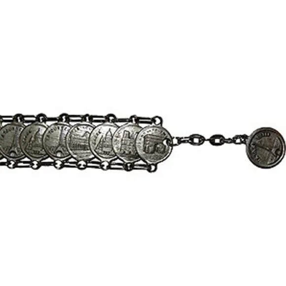 1950´s white metal bracelet depicting famous Paris landmarks on one side and the Paris crest on the reverse side. Closes with a lobster clasp and jump ring. 6.75"L with 1”L extender. Coins, 0.875”Dia each.