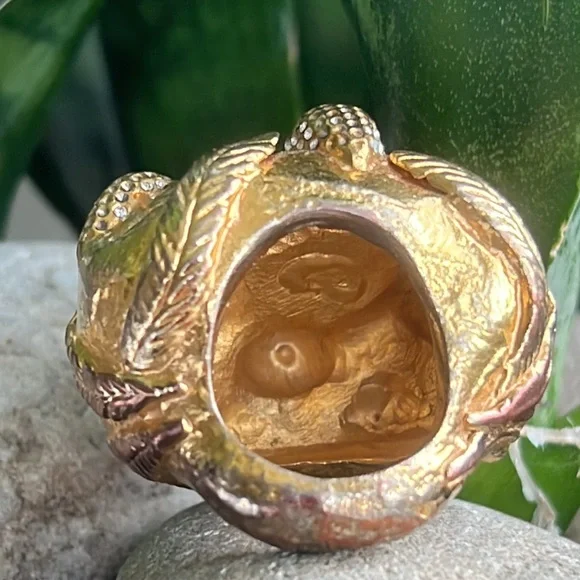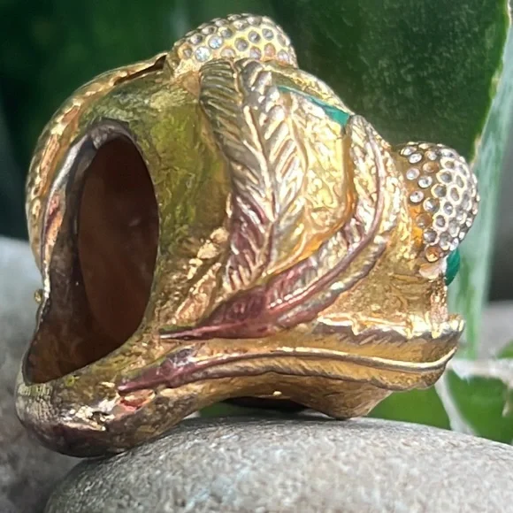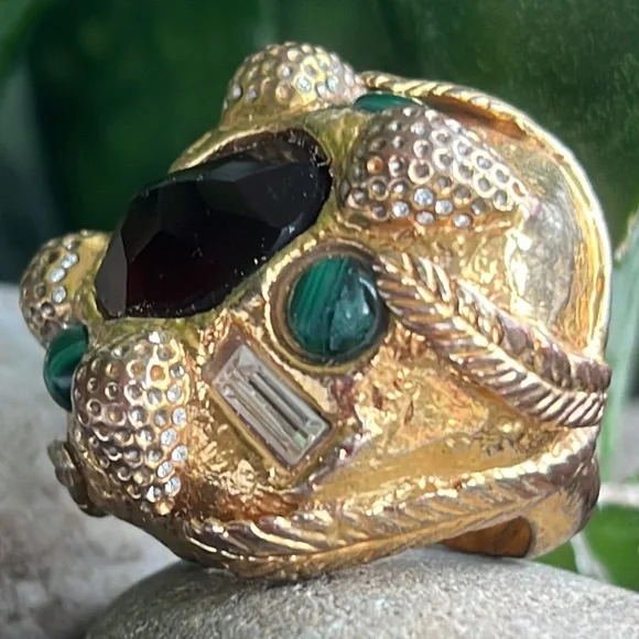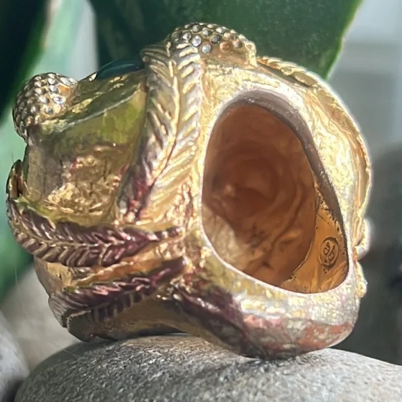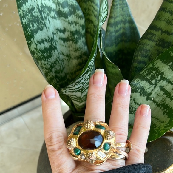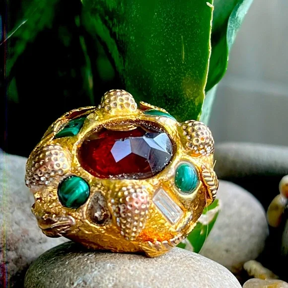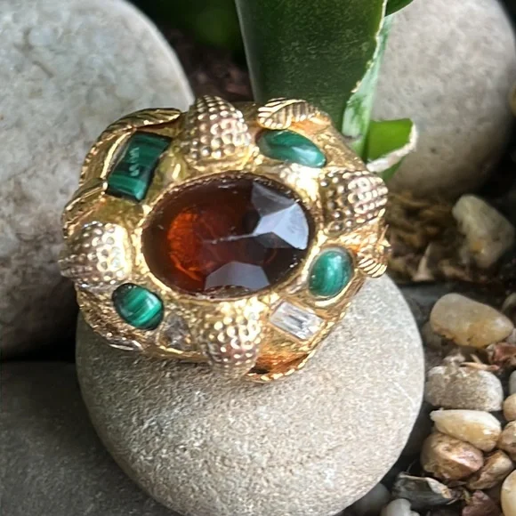 Alexis Bittar statement ring with malachite and beautiful reddish brown Centerstone as well as rhinestones with a leaf motif some of the gold is worn off in the back but not...