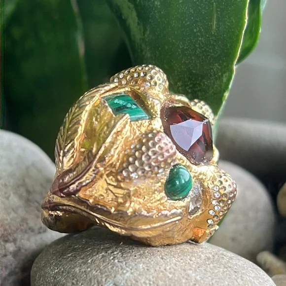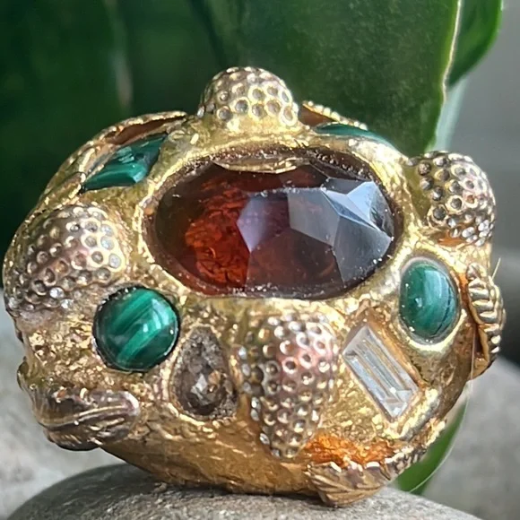 Alexis Bittar statement ring with malachite and beautiful reddish brown Centerstone as well as rhinestones with a leaf motif some of the gold is worn off in the back but not noticeable when warm