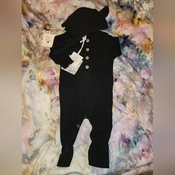 Kate quinn rompers. One NWT, Size 3-6mth.2 0-3mth Kate Quinn outfits. Both bear hats, 0-3mth. One NWT. Green hat does have a small flaw, not sure how it happened, see in pic. Both...