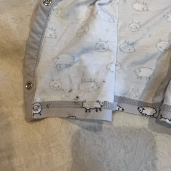 Sheep set has small spot inside looks like it will wash out. Two pique kimono tops one has slight stain on shoulder, really not noticeable. 3 pairs of pants, and socks. So...