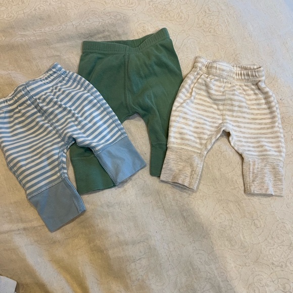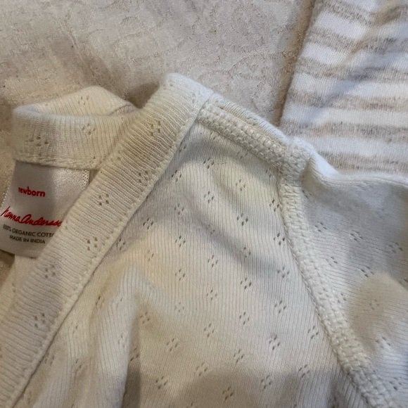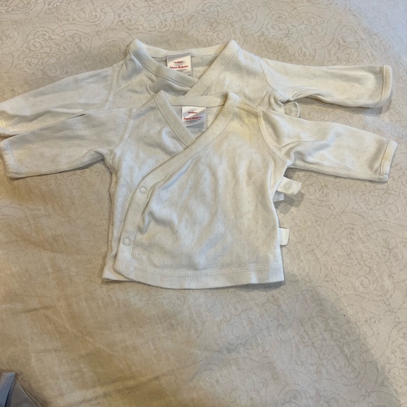 Sheep set has small spot inside looks like it will wash out. Two pique kimono tops one has slight stain on shoulder, really not noticeable. 3 pairs of pants, and socks. So adorable on, great deal.
