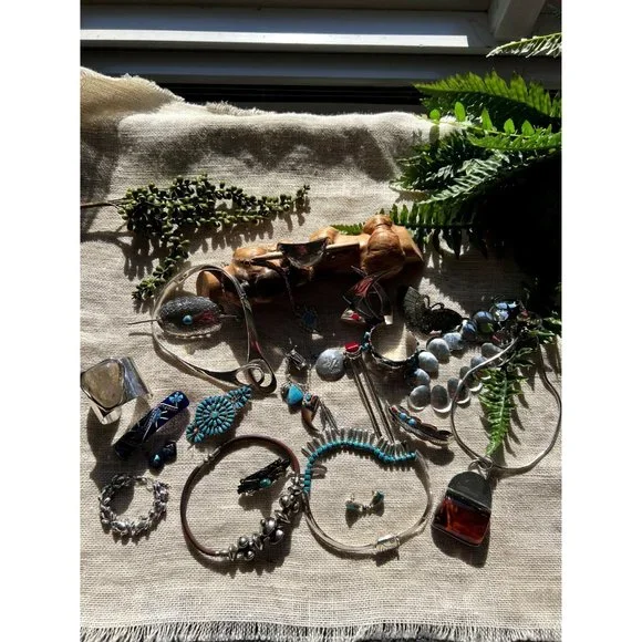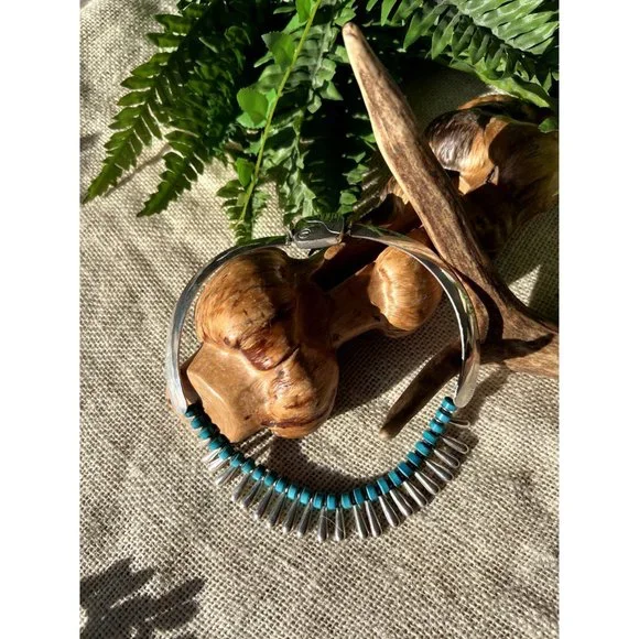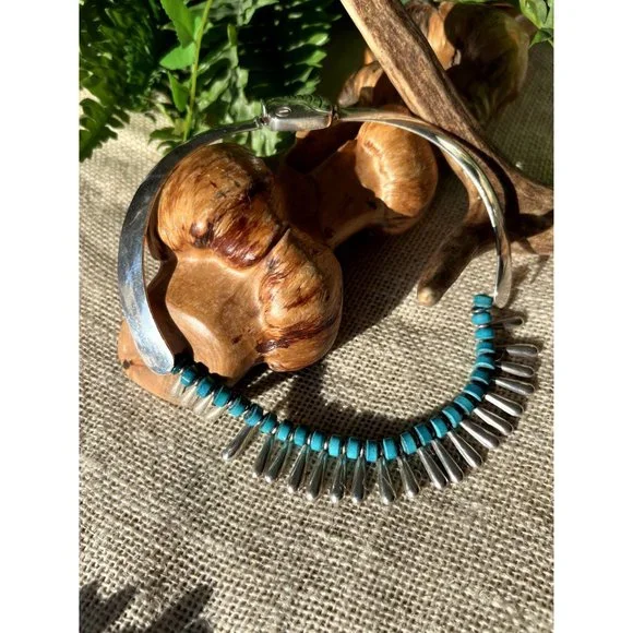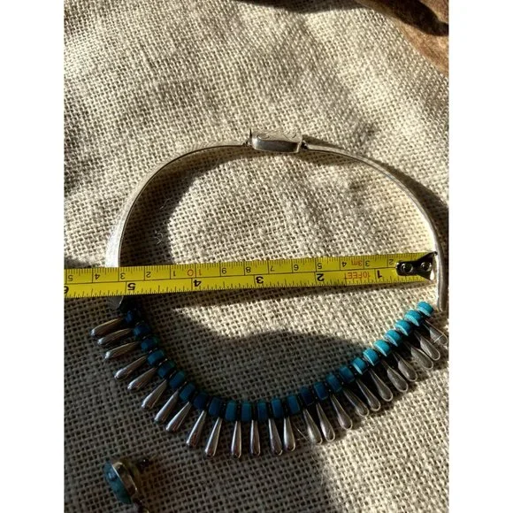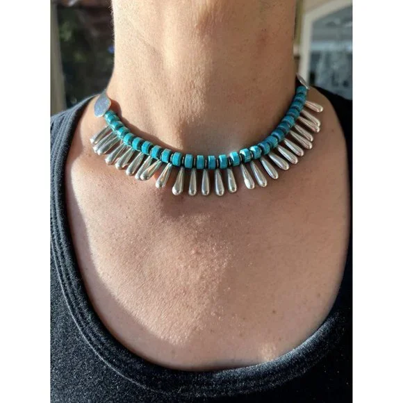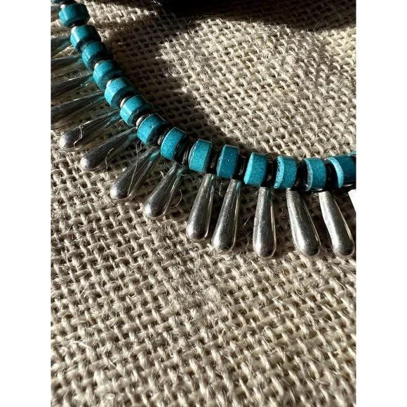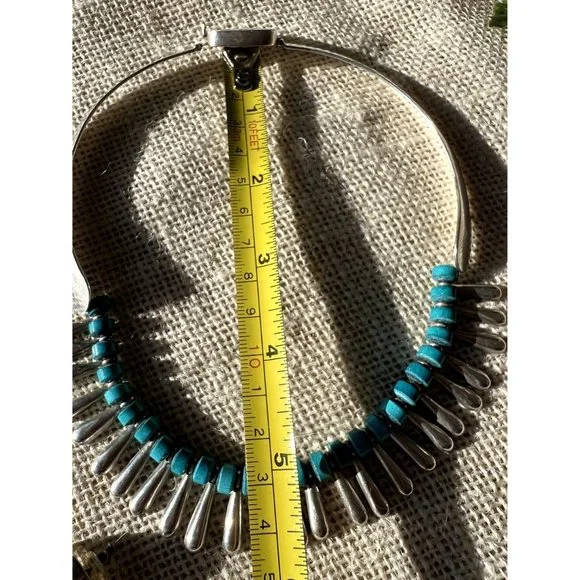 Vintage Sterling Collar Necklace Alternating Turquoise Beads Silver TeardropsAbsolutely stunning piece for the boho or southwestern style! See pictures for dimensions.This is part of a large lot of silver estate jewelry. Check back as I will be listing the very best pieces.Keep in mind this is a vintage piece and may have wear consistent with age.tags: Statement necklace, anniversary gift, southwestern necklace, chunky necklace, designer necklace, anniversary gift, 925, sterling silver, choker, boho necklace, eclectic necklace
