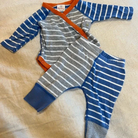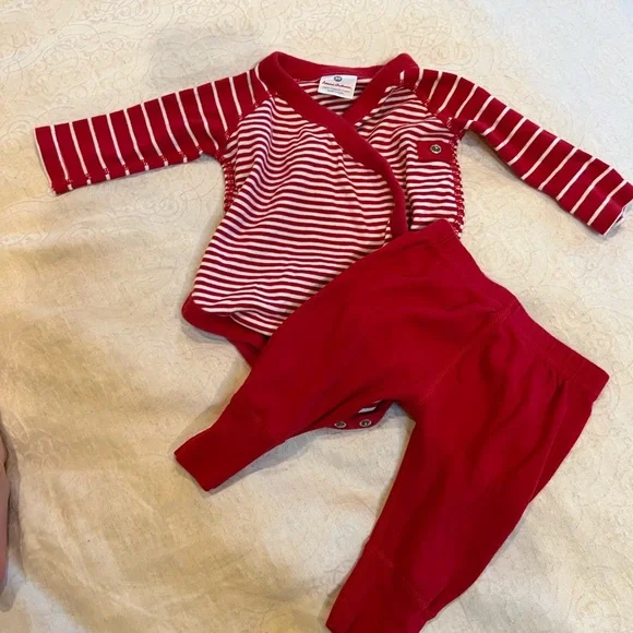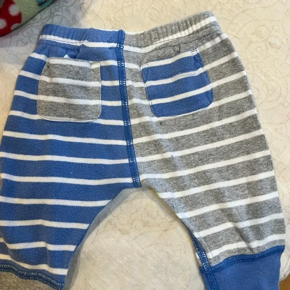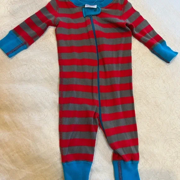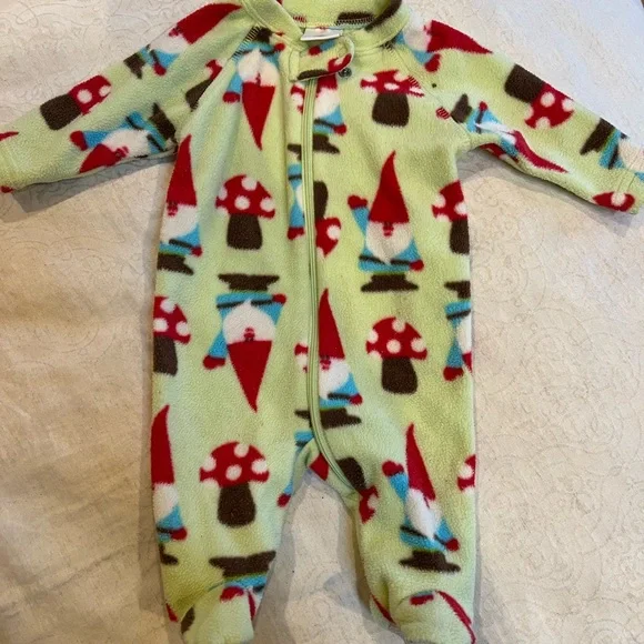 Great bundle with two matching set, union suit, footies, and socks. Great deal for this bundle. Signs of wash and wear still adorable and cozy.