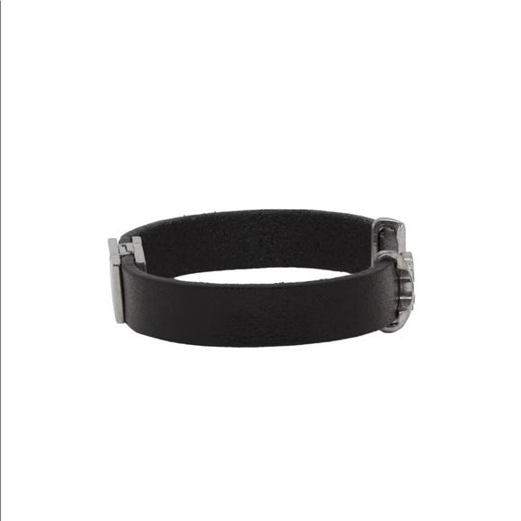 Saint Laurent Black and Silver Leather Opium Bracelet Buffed leather black bracelet. Logo plaque at face. Logo-engraved magnetic box-clasp fastening. Silver-tone hardware. Approximately 7.5” length. Leather Made in Italy