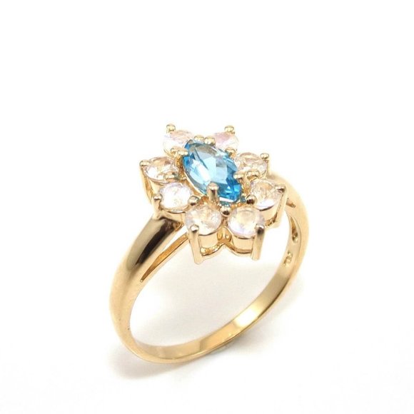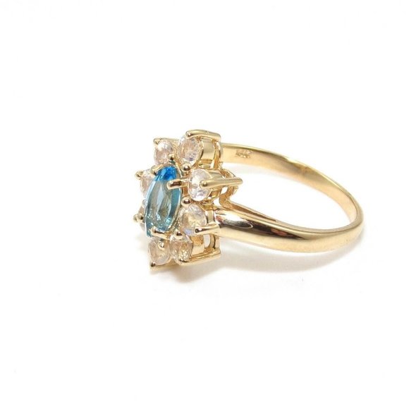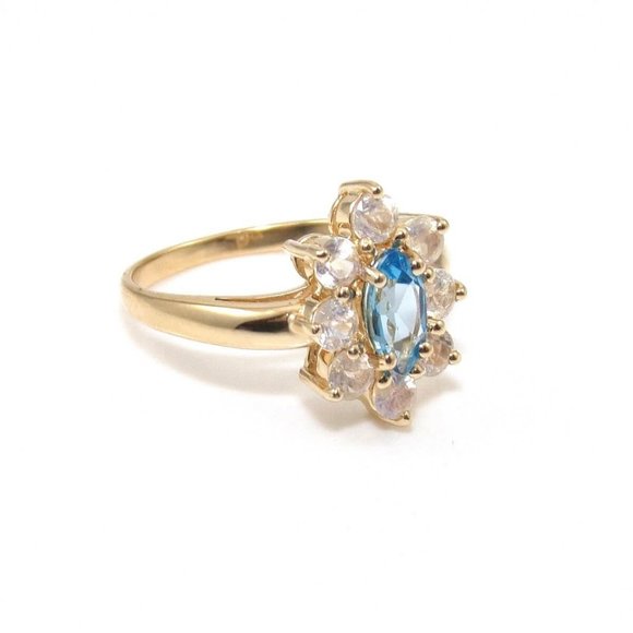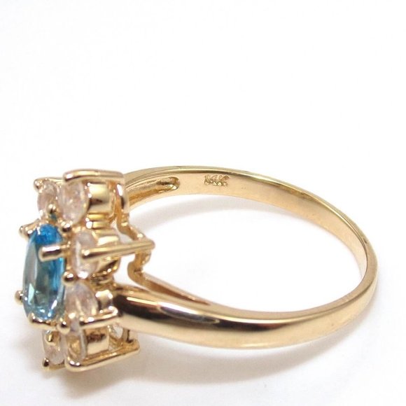 For offer is a 14K Yellow Gold Blue Topaz Halo Ring Size 8.25.Details listed below.**I AM NOT 100% SURE OF THE STONES SURROUNDING THE TOPAZ**RING SIZE ~ 8.25RING FACE (MM) ~ 15 x 10GRAM WEIGHT ~ 3.5MAIN STONE ~ TOPAZMAIN STONE SIZE (MM) ~ 8 x 4TCW NON DIAMOND - APPROX ~ 1.30HALLMARKED ~ YESTESTED ~ YESPlease contact me with any issues or questions. Thank you for your interest and business.--------------------------------------CHK-12-AC053-A2