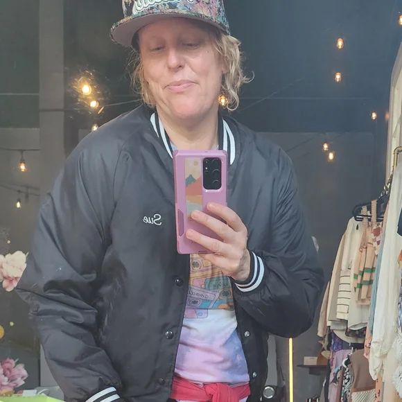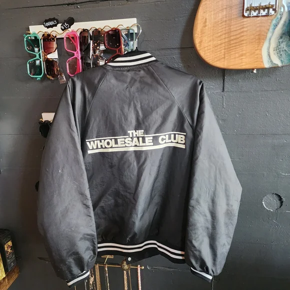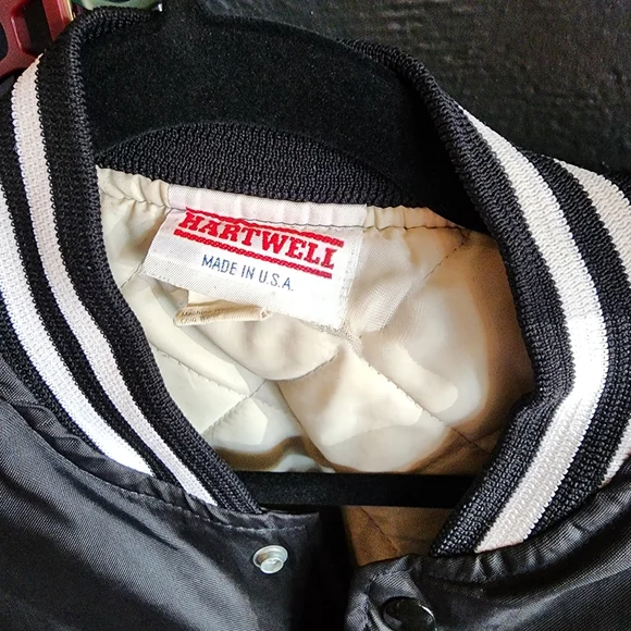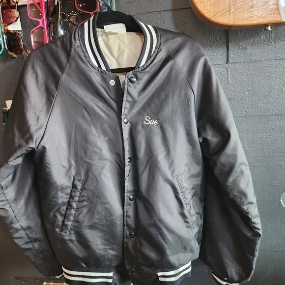 Experience the perfect blend of style and comfort with the SUE Black Varsity Bomber Jacket. Crafted with a smooth finish, this jacket features ribbed cuffs and waistband for a classic look. Its versatile design makes it an essential addition to any wardrobe, offering a relaxed fit for everyday wear. Minor wear and some paint splatter but very small and does not affect the integrity. Perfect for your vintage 80s collection. Boy or lady named Sue.