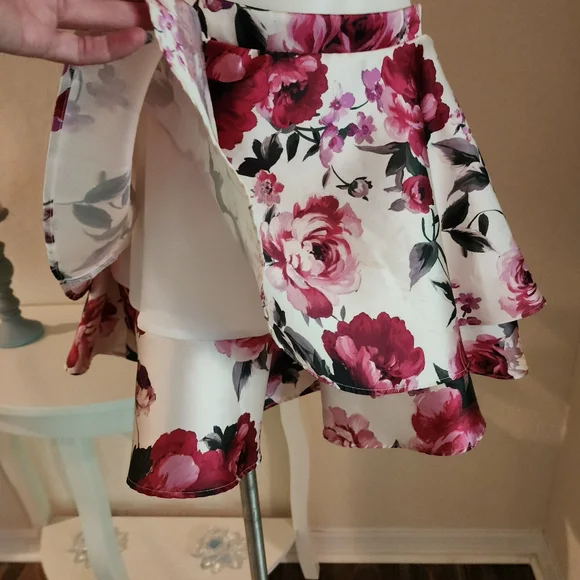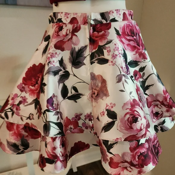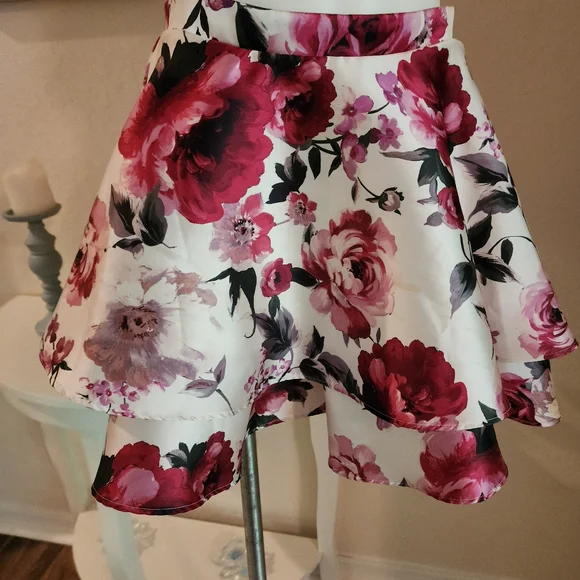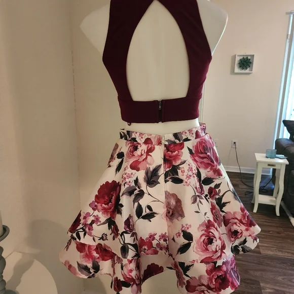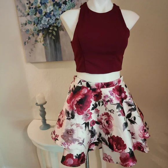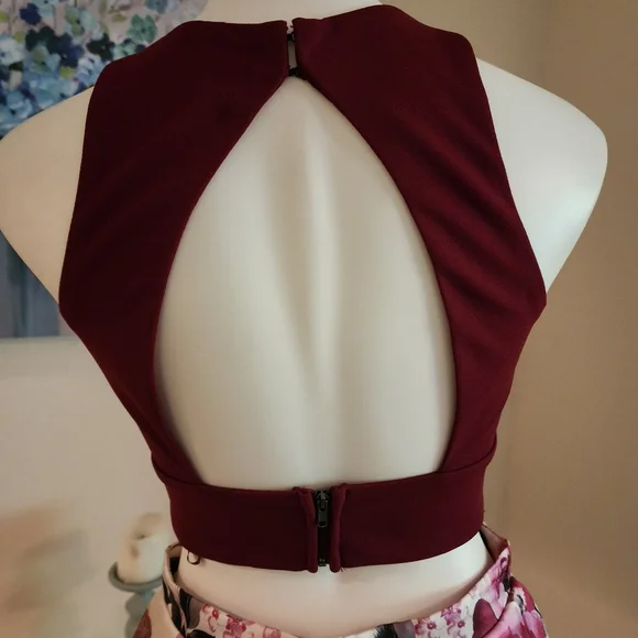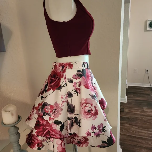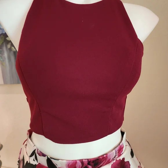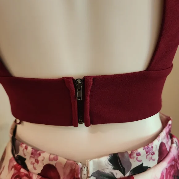 Solid Dark red sleevless mid shirt, feels velvety. Hooks behind neck and zips behind back. 12 " top to bottomslight stretchFlower print A line skirtmeasurements:length 16" waisted...