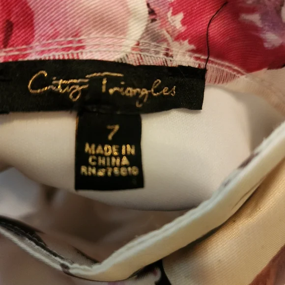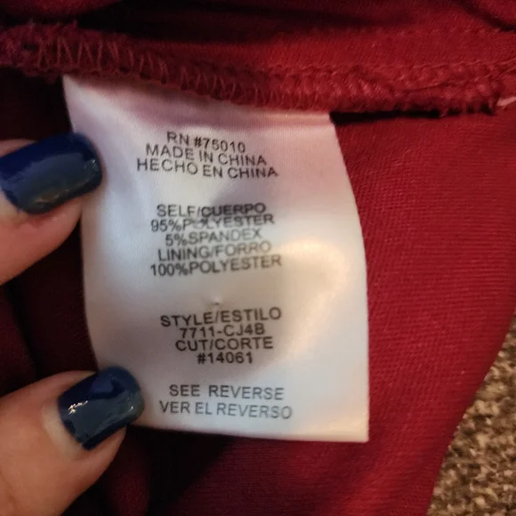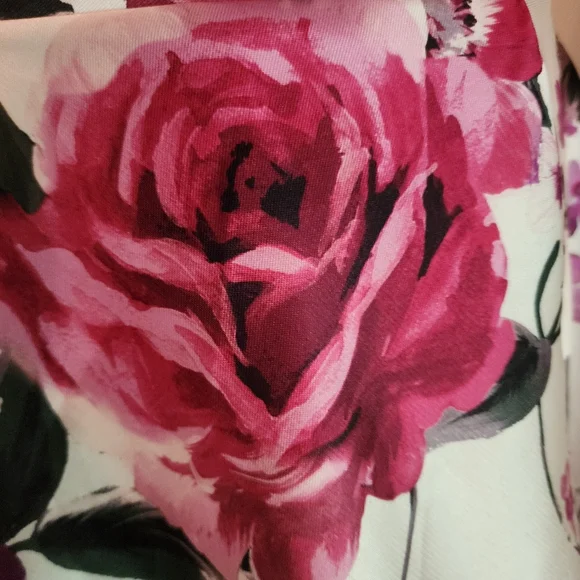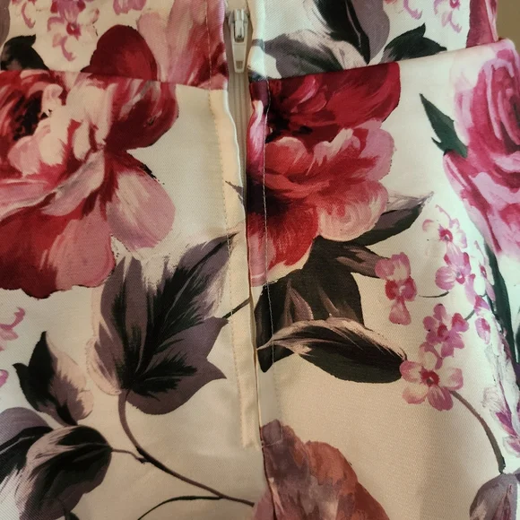Solid Dark red sleevless mid shirt, feels velvety. Hooks behind neck and zips behind back. 12 " top to bottomslight stretchFlower print A line skirtmeasurements:length 16" waisted 14 1/2 "no stretch worn wonce & dry cleaned