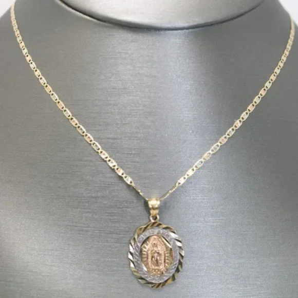 14kt Tri-tone Virgin Mary 15 Anos Engraved Pendant with 14kt Tri-tone Hollow Trace ChainPendant Thickness22mmPendant Weight 2.8gPendant Carat14ktChain Weight1.9gChain Thickness1.9mmChain Length 16inPendant & Chain Weight 4.8g