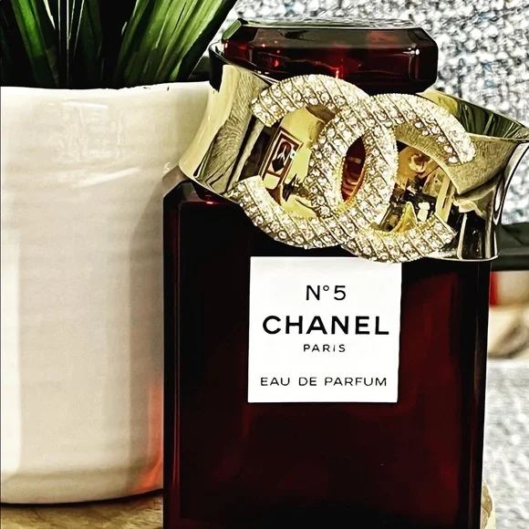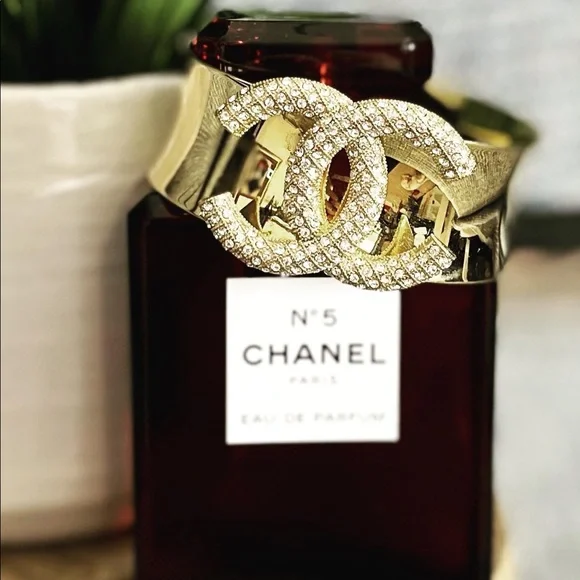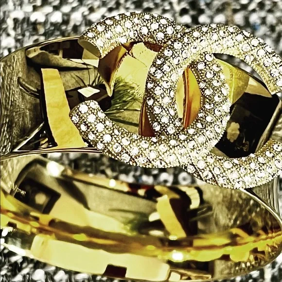 Gold tone bangle bracelet that has been brought to life with the addition of an interlocking CC Brooch. Brooch pin was damaged, thus removed and added to the bangle. Gorgeous sparkly bling piece that can be worn alone or layered.